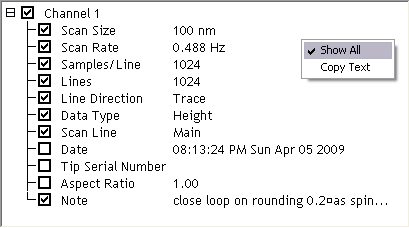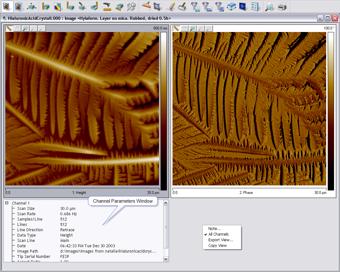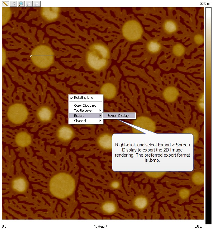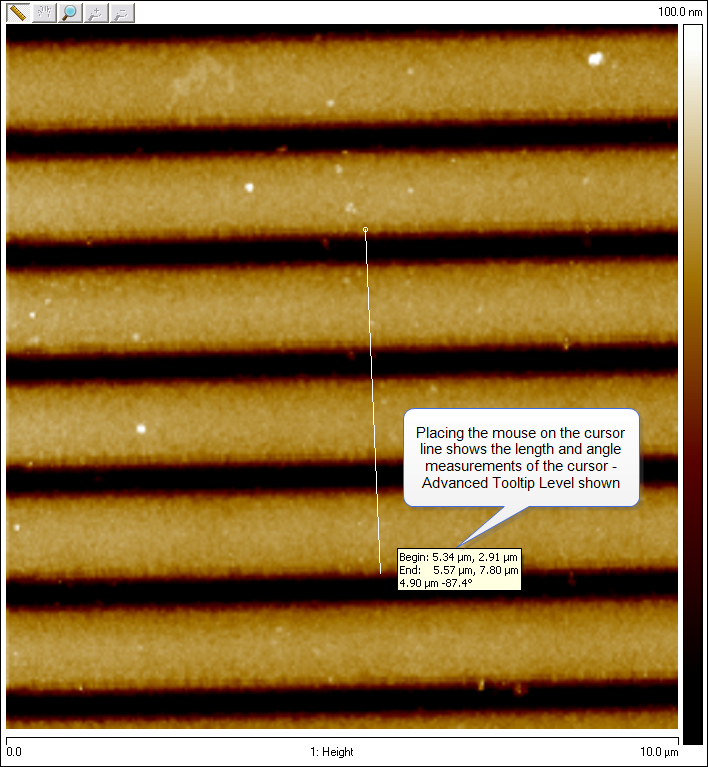 The Image analysis displays the selected image with color-coded height information in a two-dimensional perspective. Image analysis is the default NanoScope analysis such that when an image is initially opened it is always rendered in Image. | ||||||||||||||||||||||||